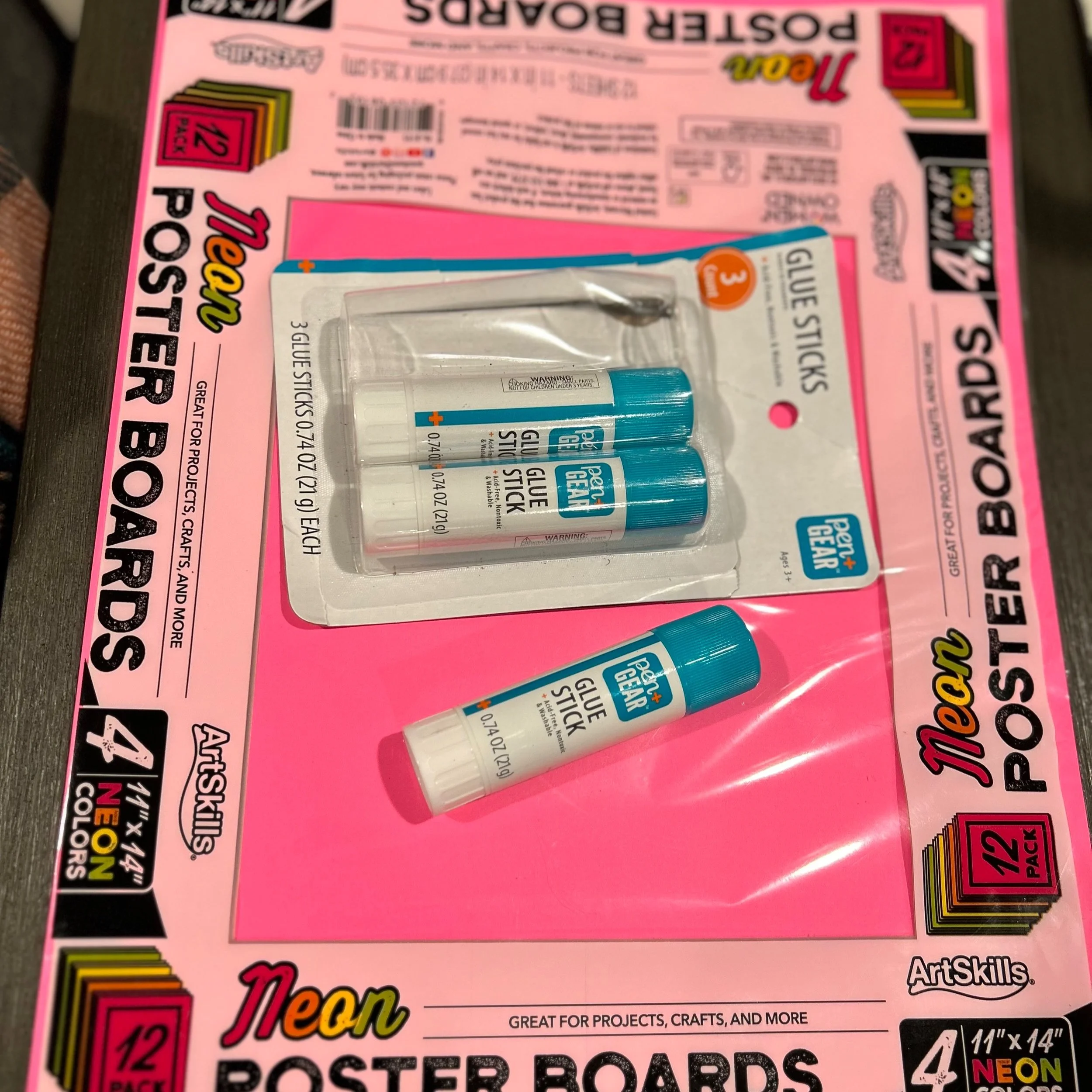 4 pack poster board with my favorite colors. Glue sticks because I didn’t have any. Total of $5 plus tax.